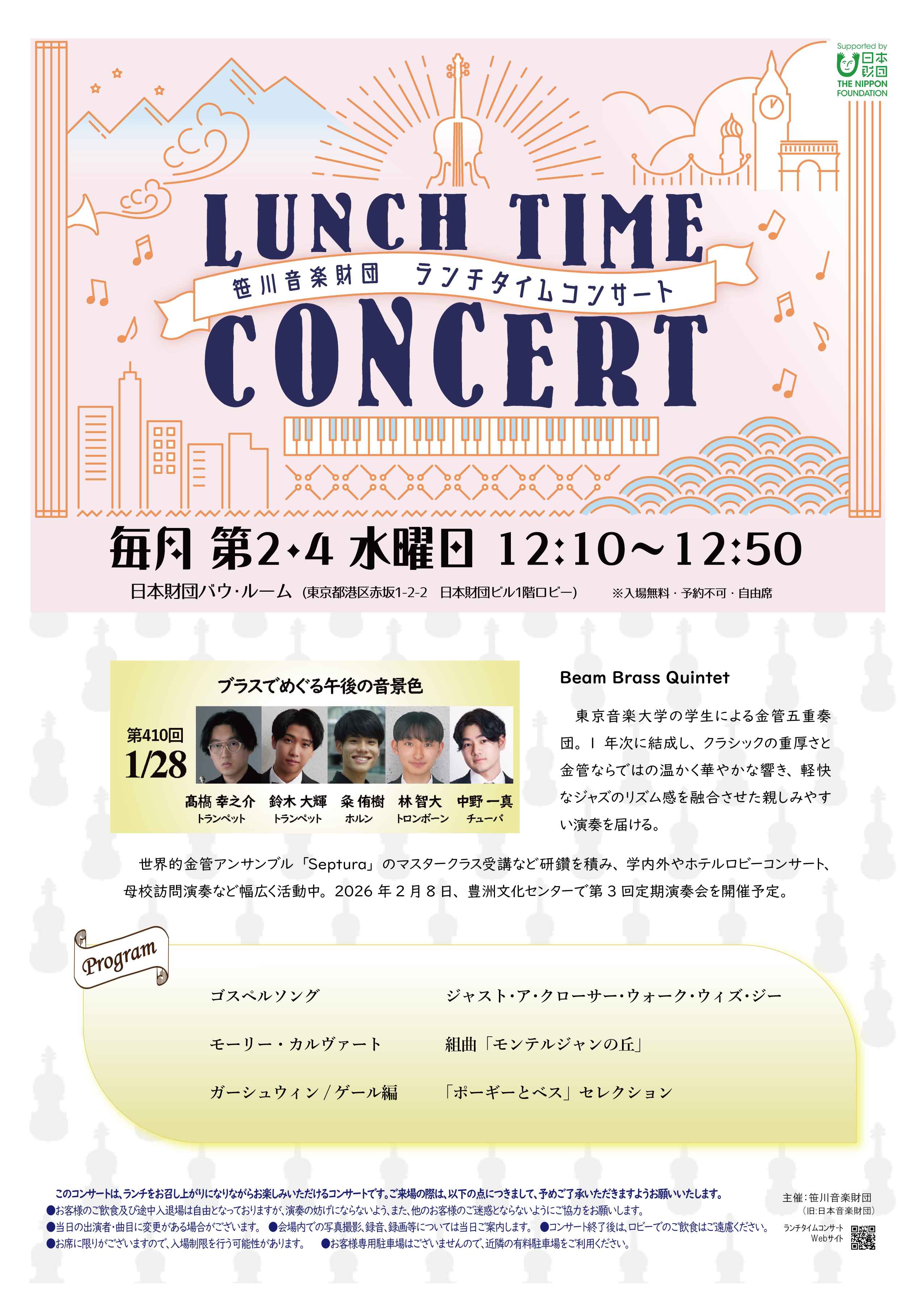 笹川音楽財団はランチタイムコンサートの出演者の募集をしています。詳しくはこちらからご確認ください。